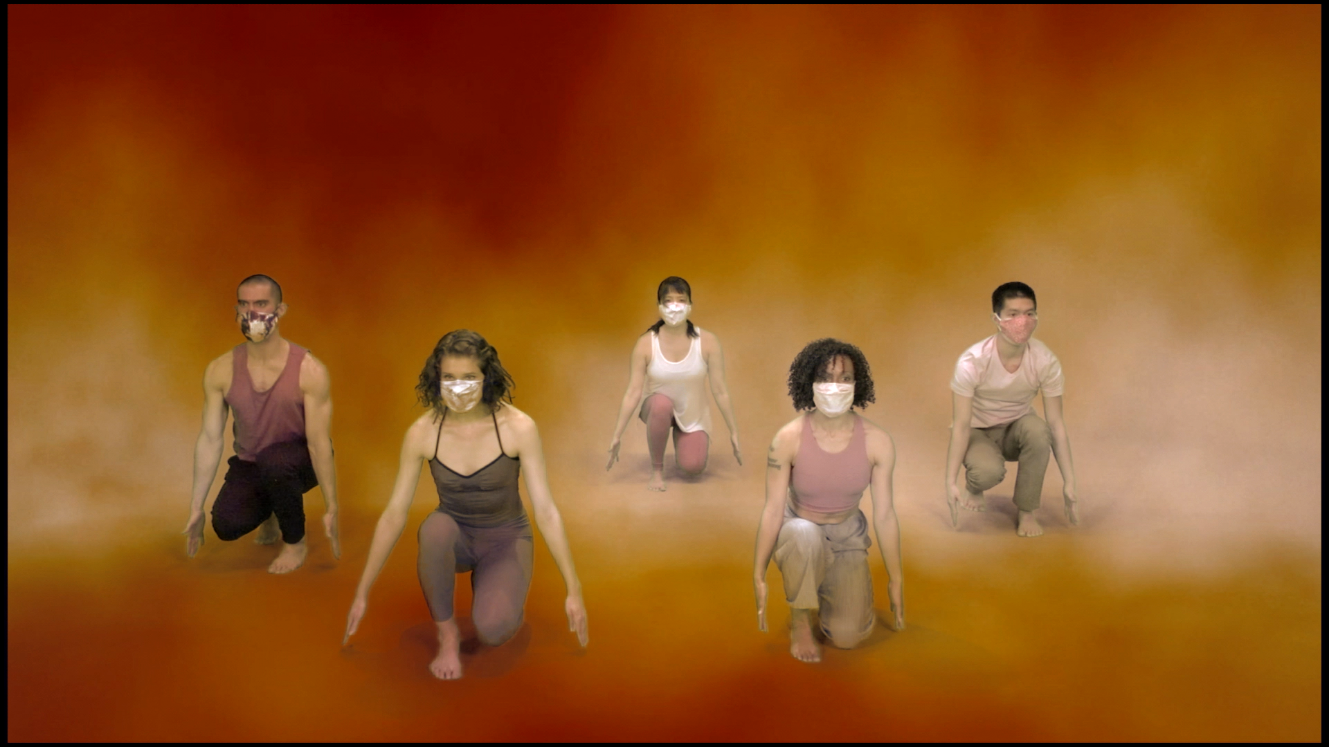 Still from the dance, “Breath”, from the film, “SPEAKOUT’. Directed by Lorca Peress, Projections by Jan Hartly, Costumes by Lisa Renee Jordan. With dancers L-R, Oscar Rodriguez, Madeline Jafari, Jennifer Chin, Anne Parichon, Richard Sayama.